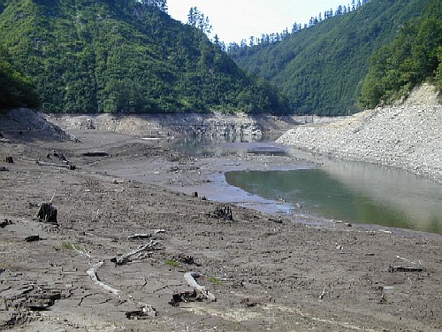 奥利根湖、割沢出合。 水がずいぶん少ない。小穂口の出合まで泥ラッセル。 帰りはさらに少なくなっていた。