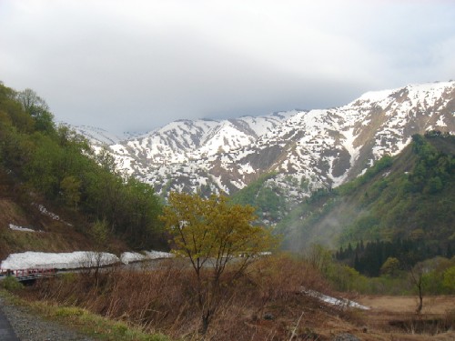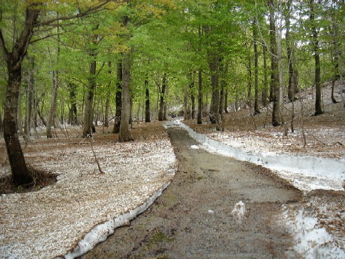 温身平の残雪とブナの芽吹き