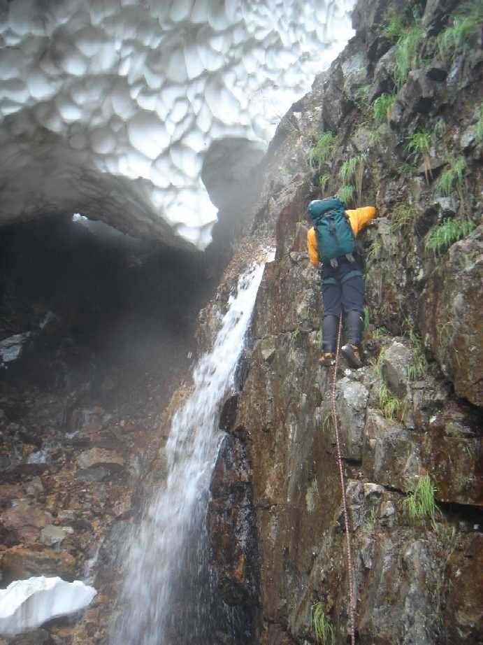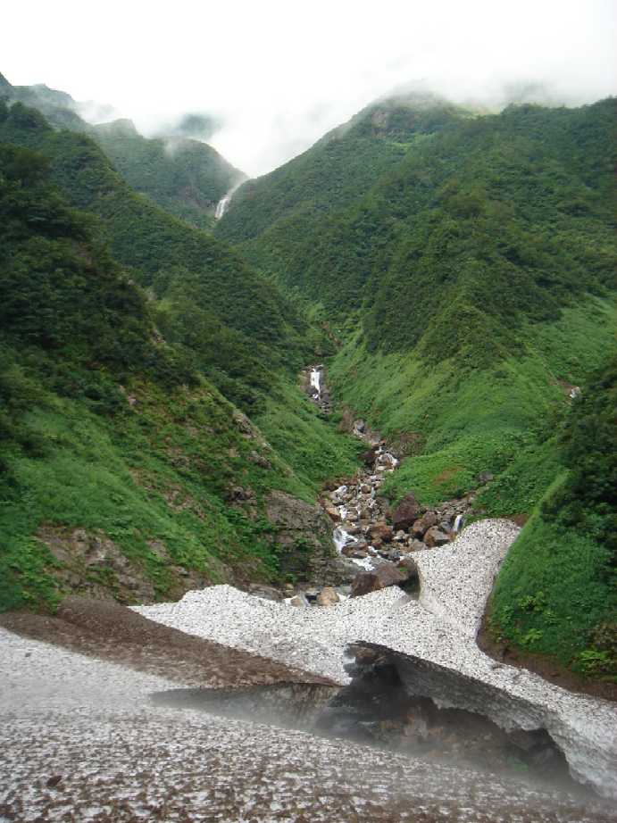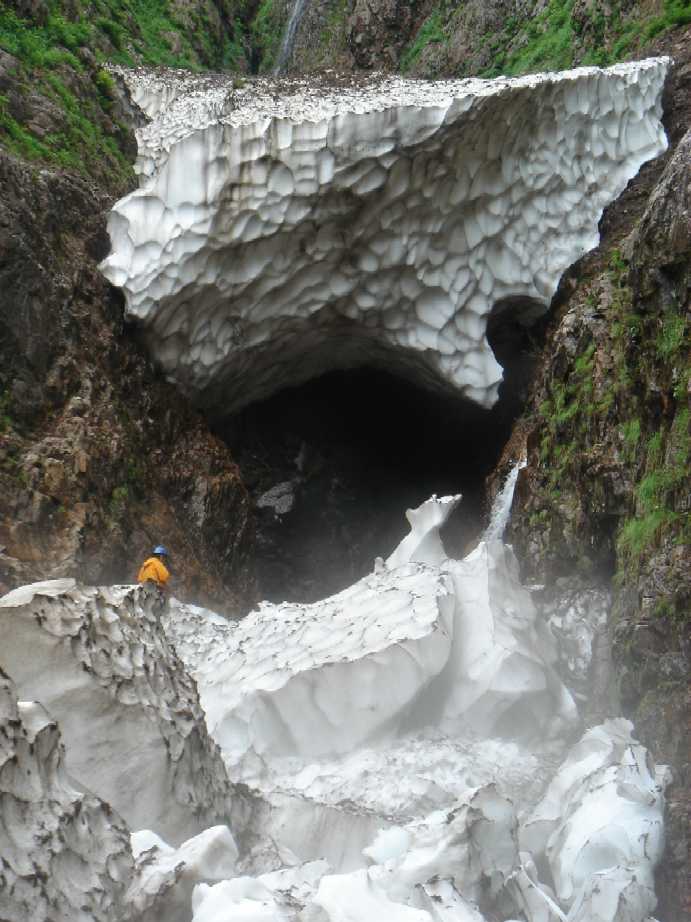 雪渓がV字ゴルジュをふさぐ