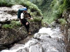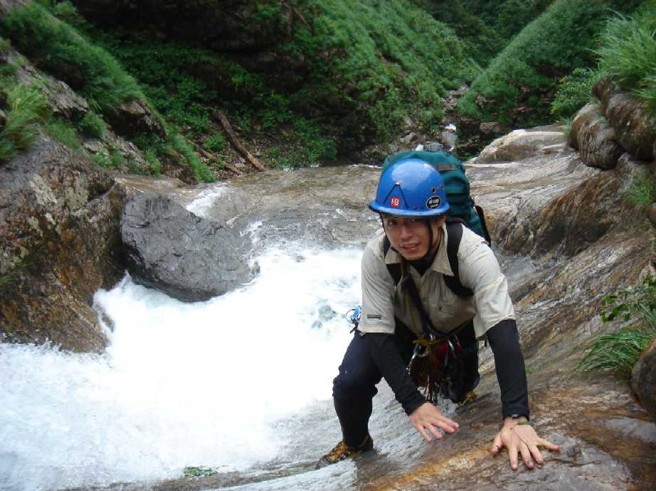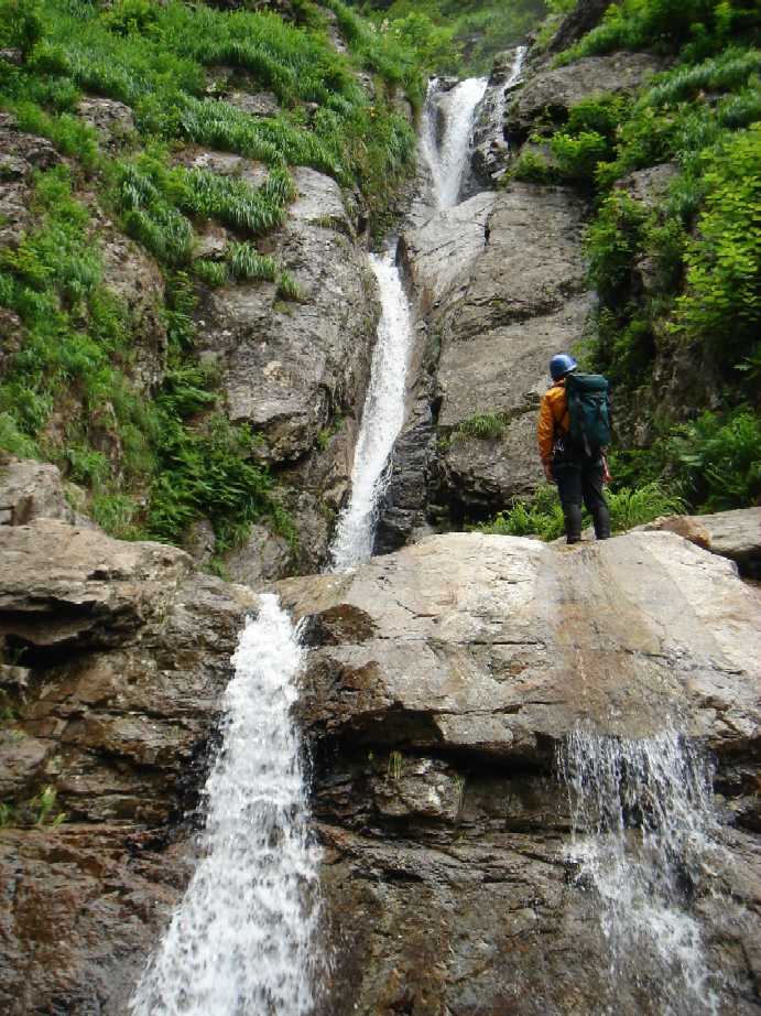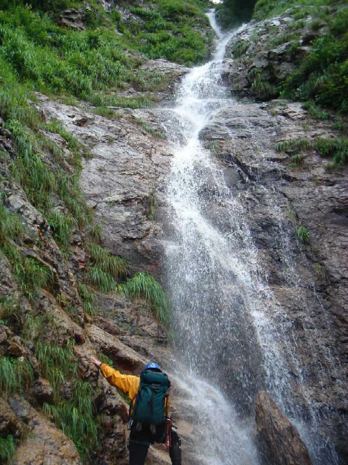3番目?の滝。左壁をトラバース気味に落口へ。かなりシビアです。