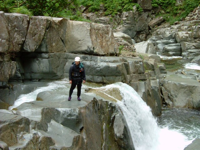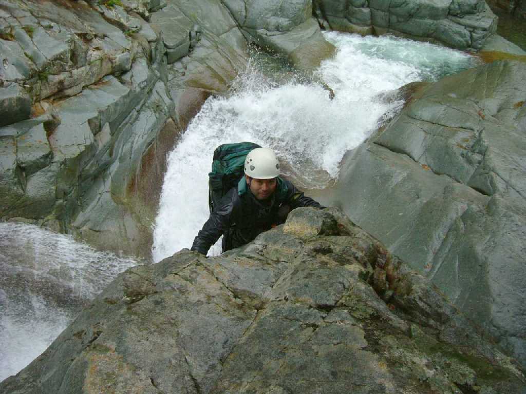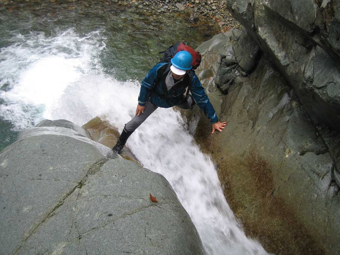 2条10mの滝 右岸のバンドから真ん中の岩に取り付く