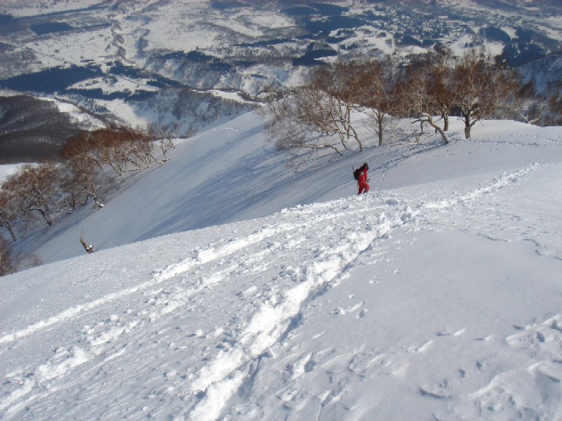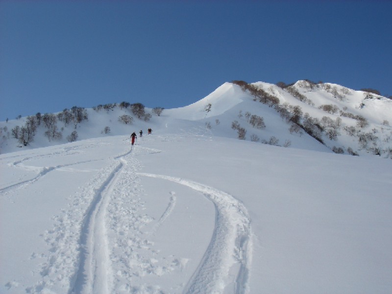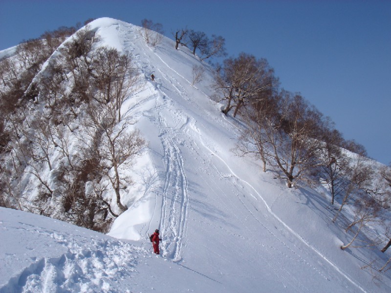 頂上近くなると尾根は痩せクラスとした斜面に新雪が乗り、スキーでの登高は無理となる。