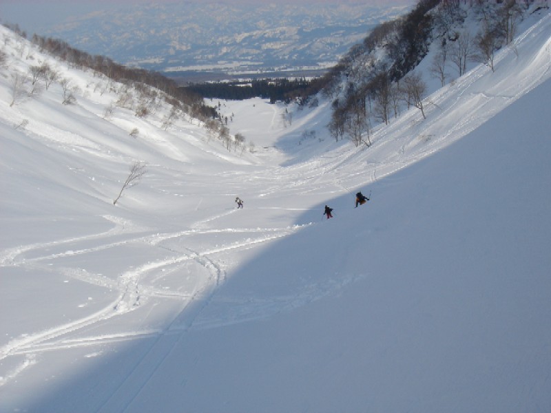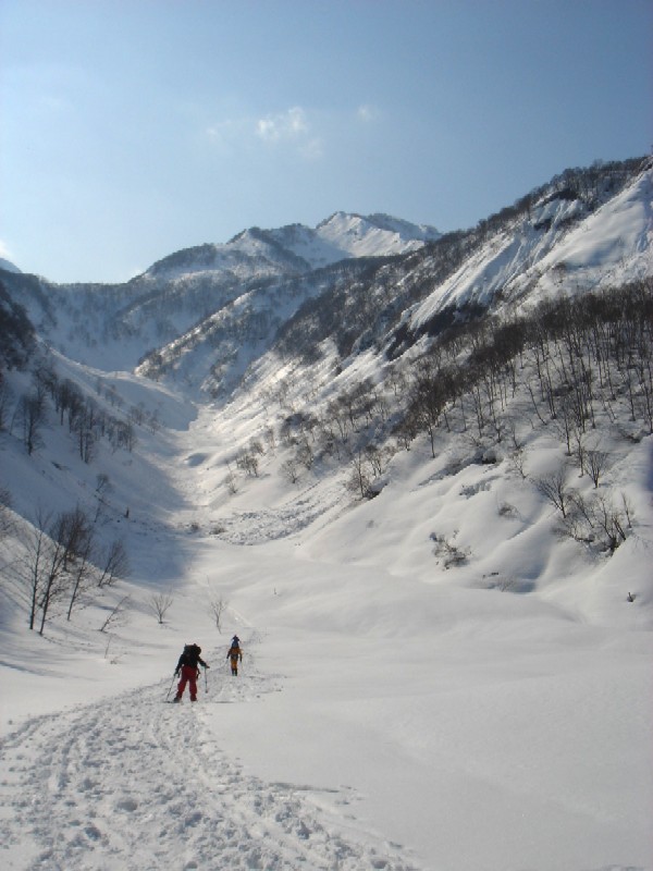 ブナ林の尾根は雪が腐り快適ではないので右の沢へ入る。日陰はまだパウダーが残る。