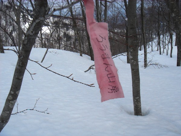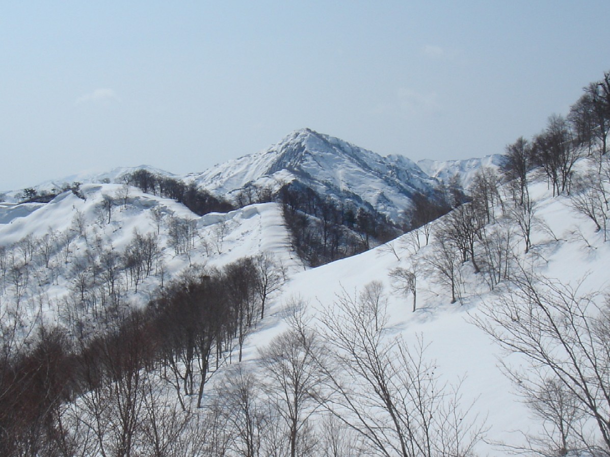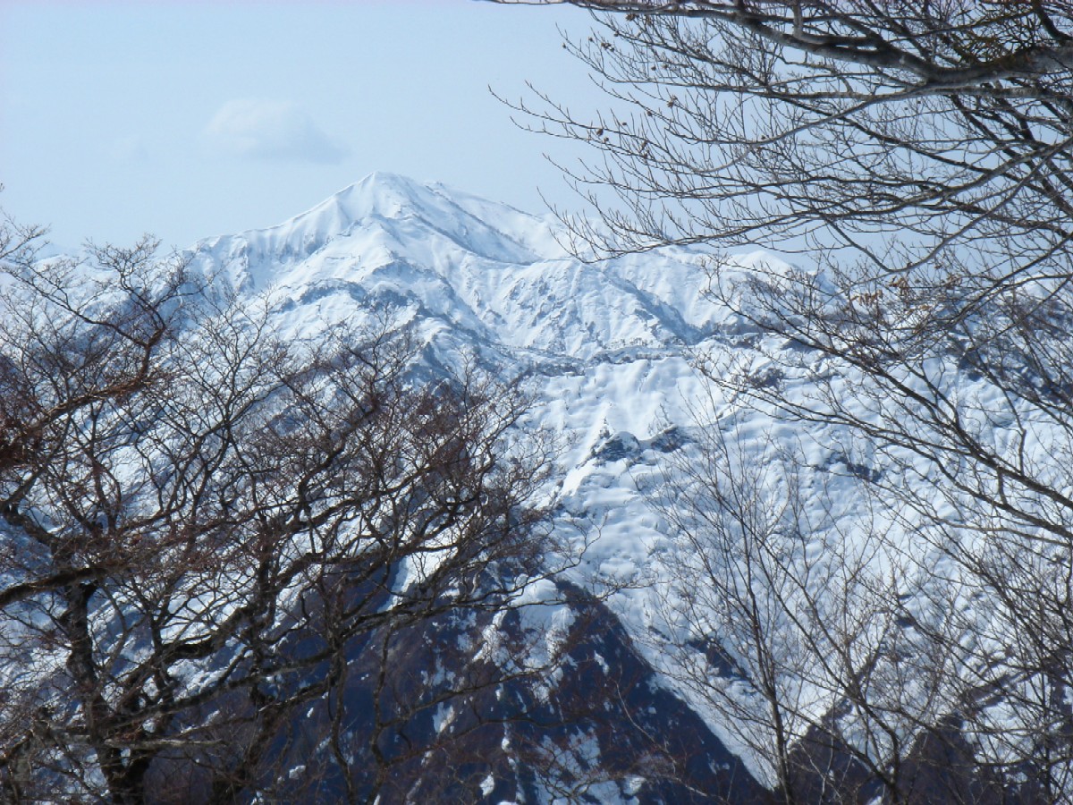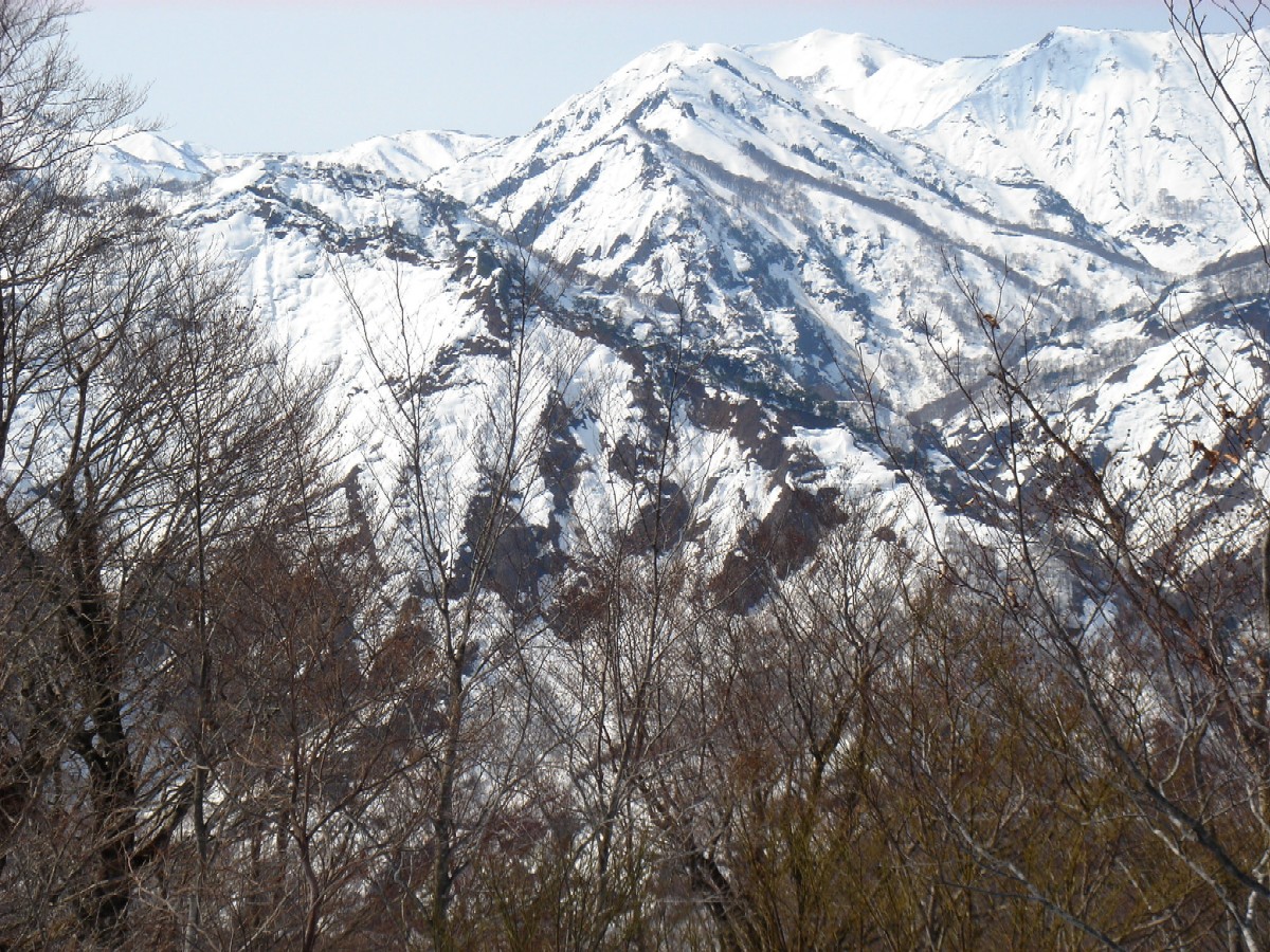 舟窪山からヤジロ尾根下部・・・雪落ちてます。遠くに青里岳。谷底は見えない。