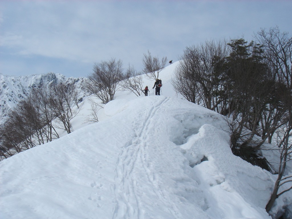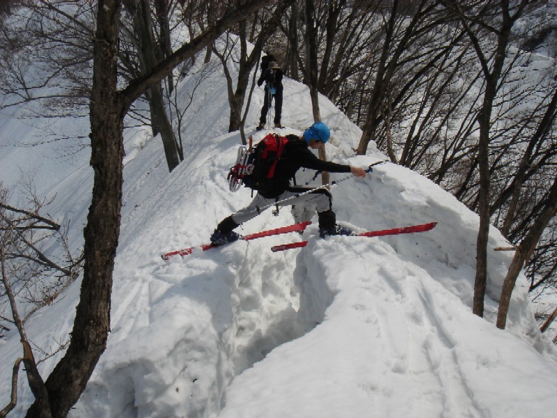 大湯〜駒ノ湯間はデブリ回避2箇所有り。池ノ塔尾根は所々雪が切れスキーは手別山手前ピークで断念。