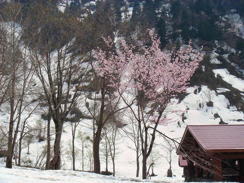 山を下りると雪の中に桜が咲いていた。(馬場島にて)